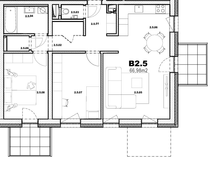 - Vodovodný rozvod studenej a teplej vody privedený do bytu po uzatváracie ventily v kúpeľni, WC a kuchyni